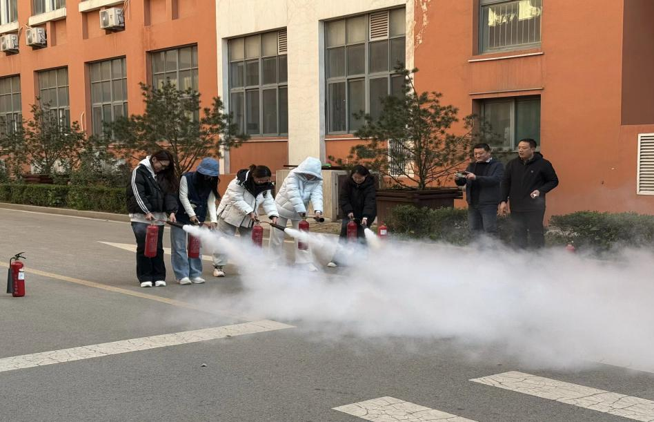 随着警报声响起,同学们迅速用湿毛巾捂住口鼻,沿指定疏散路线快速、有序撤离至安全区域。各点位疏散人员分工明确、及时到位,全程保障疏散通道畅通。在培训环节中,专业老师讲解了火灾扑救常识,并重点演示了灭火器的正确操作步骤与注意事项。同学们主动上前实践操作,切实掌握了灭火器“提、拔、握、压”的使用要领,将理论知识转化为实际应用。