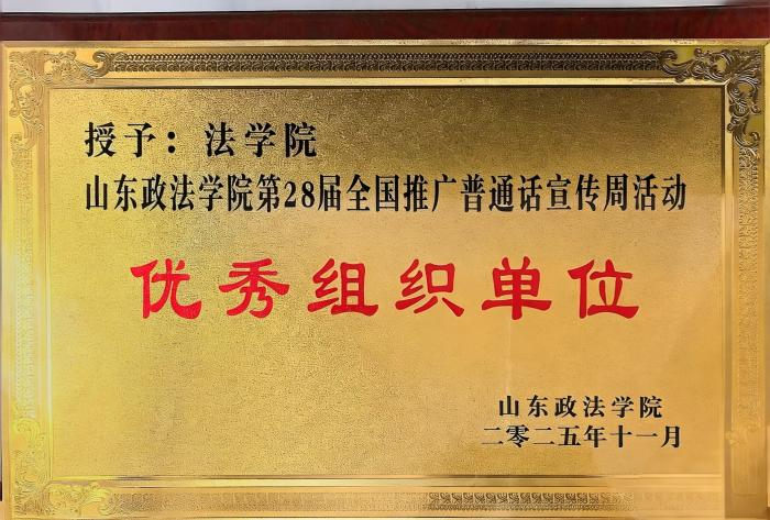 2025年9月15日至21日,在第28届全国推广普通话宣传周期间,法学院紧扣"七秩传承讲法治,语言铸魂促交融"主题,在全院范围内掀起了一场语言文化与法治精神交相辉映的宣传热潮。在这场文化盛宴中,法学院凭借卓越的组织能力与创新实践,荣获"优秀组织单位"荣誉称号,为校园文化建设再添华章。