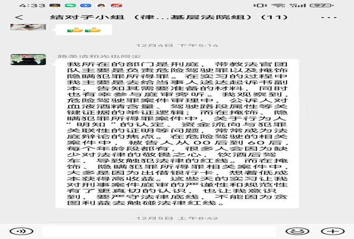 2025-2026学年第1学期,2023级全体同学分赴各地法院、检察院、律师事务所、仲裁委等单位进行专业实习。为深入推进实践历练与知识深化的有机结合,增强不同单位间实习体验的互学互鉴,营造互帮互助、团结进取的良好氛围,法学院2023级1-6班组织开展了为期八周的“实习路上结伴行,备考途中共进步”经验交流结对子活动。