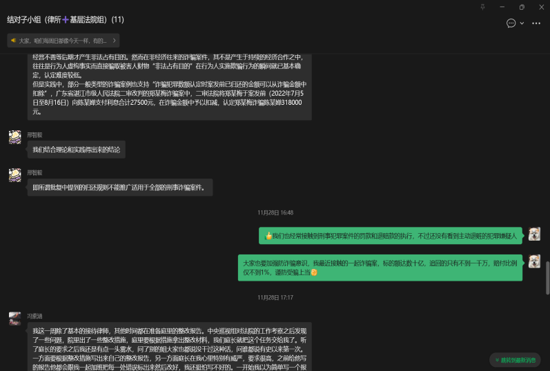 同学们根据见习单位类型(如基层法院、中高级法院、检察院、律师事务所、仲裁委等)及地域特点进行灵活分组,每两组之间结成学习对子,并实行每两周轮换一次的机制,同学们围绕“备考实用工具推荐”“实习生活日常分享”“典型案例分析研讨”等主题展开交流,既涵盖了实用技能与资源互通,也融入了真实场景下的思考与感悟。同学们在线上讨论中积极发言、互相启发,在交流中深化理解,在分享中共同成长。