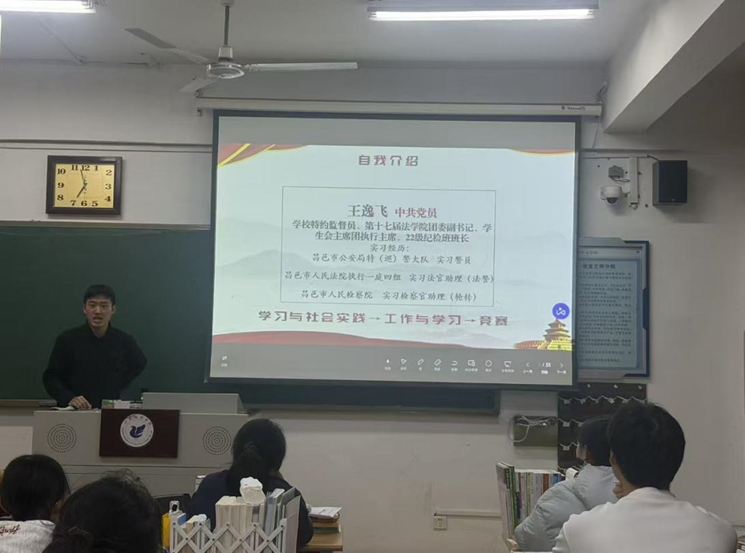 王逸飞学长以“大学四年,你想成为一名什么样的学生?”为导入,结合自身经历,分享心得。在“学习与社会实践”部分,他从亲身经历的实习案情切入,阐述了“从实务感知部门运作,再从部门实践回归理论深化”的认知路径,并强调实务与专业知识的重要性。