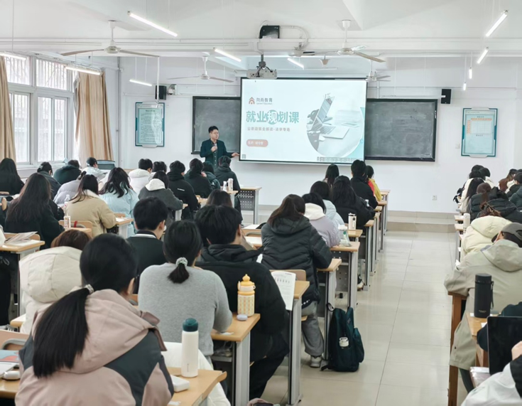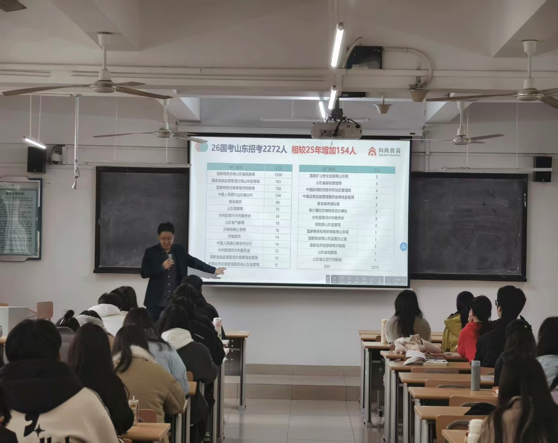 讲座现场,指导老师结合当下就业形势与公职类考试最新政策,围绕国考、省考、国企招聘、军队文职四大核心板块展开细致讲解。针对各类考试的报考条件、招录流程、岗位差异、政策优势等关键信息,老师用通俗易懂的语言逐一梳理,重点分析了应届生在各类公职及国企招考中的专属优势,让同学们清晰掌握不同考试的报考要点与核心区别,破除了大家对公职类考试的认知误区。